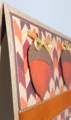 Here you can see that I inked around the bottom section of each acorn, embossed the brown tops with a herringbone embossing folder and then popped each acorn up on one layer of foam tape.