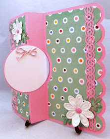 I left the inside circle blank to leave room for a short note and signature. The flowers are from Petaloo with some added enamel dots for the centers. The pink trim is a Martha Stewart punch called Double Link Trim. The leaves are an EK Success punch.