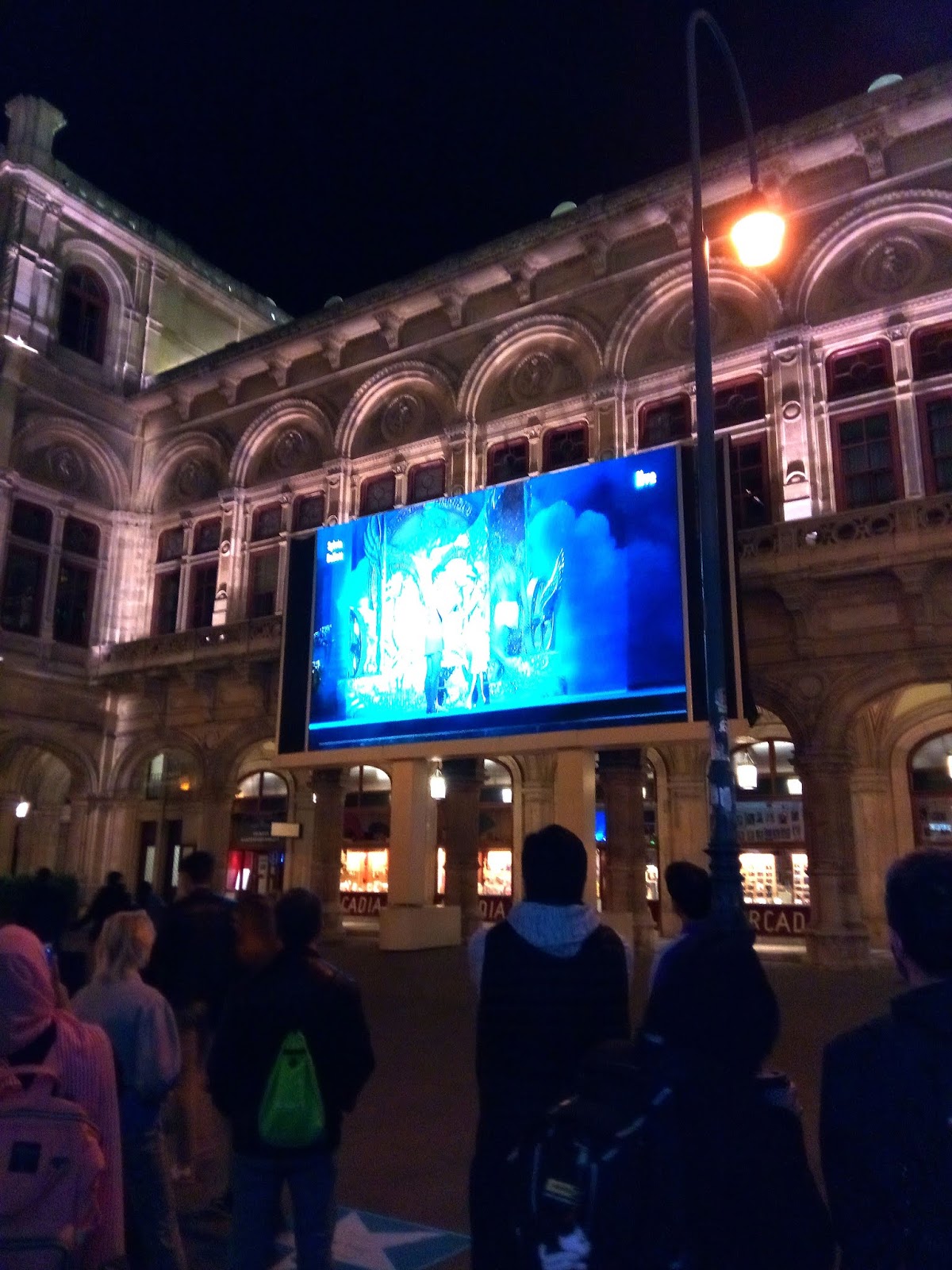 One of the neat things that the Opera House does is, once a month, they project a live performance on a screen outside the building so that all Viennese and visitors can enjoy whatever happens to be performed on stage that evening. We were able to watch a live ballet on the screen on the very same day we had toured the building. What a treat!
