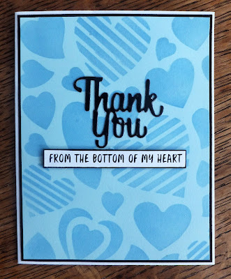 Two wonderful cards using that heart stencil Cheryl! I love the blue on blue look of your thank you card and I imagine that shimmer adds a really nice touch! Love the shiny black die cut thank you too! And great work on masking off those extra hearts on the stencil so you could make your row of rainbow hearts for your 2nd card...perfect for a Valentine's card! Thanks so much for sharing with us at The Twofer Challenge!! :0)