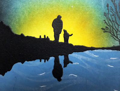 This was another quick card. I did some ink blending on a light blue piece of CS to create a sunset (or is it a sunrise?). I also ink-blended my "lake" beneath my sky. I stamped some foliage on the right hand side, masking off my water, then I glued my black die-cut across the panel where the sky and water meet.