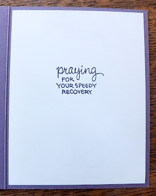 Once the ribbon was in place, I adhered a stamped sentiment circle with foam squares, and then the entire panel was added to my lavendar card base.